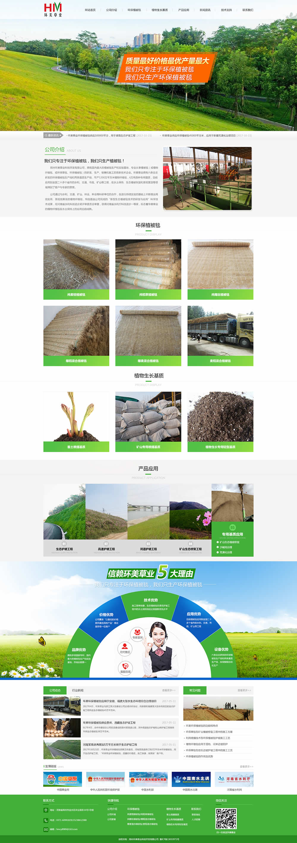 鄭州環(huán)美草業(yè)科技開發(fā)有限公司,擁有國內(nèi)大的環(huán)保植被毯研發(fā)和生產(chǎn)基地,擁有國內(nèi)的客土噴播專用基質(zhì)生產(chǎn)線,是專業(yè)從事環(huán)保植被毯(又稱植物纖維毯、環(huán)保草毯、環(huán)保植被毯、生態(tài)毯)和客土噴播專用基質(zhì)研發(fā)、生產(chǎn)和銷售的科技型企業(yè)。環(huán)美草業(yè)一直致力于產(chǎn)品與技術(shù)的創(chuàng)新,擁有多項專利生產(chǎn)設備和專利產(chǎn)品,包括六條自主研發(fā)的環(huán)保植被毯生產(chǎn)線和兩條基質(zhì)生產(chǎn)線,年產(chǎn)環(huán)保植被毯1200萬平方米,年產(chǎn)客土噴播專用基質(zhì)8萬立方米。目前產(chǎn)品應用到全國二十多個省市的水利、交通、市政、礦山等工程。